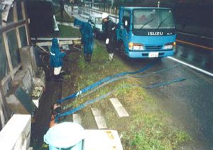 積雪があった場合の除雪活動や、毎年の地域の防災訓練、水防訓練等に参加しています。 また、自然災害発生時、被害の拡大を阻止するための応急処置等に出動します。 【台風23号】 冠水処理 市内某所